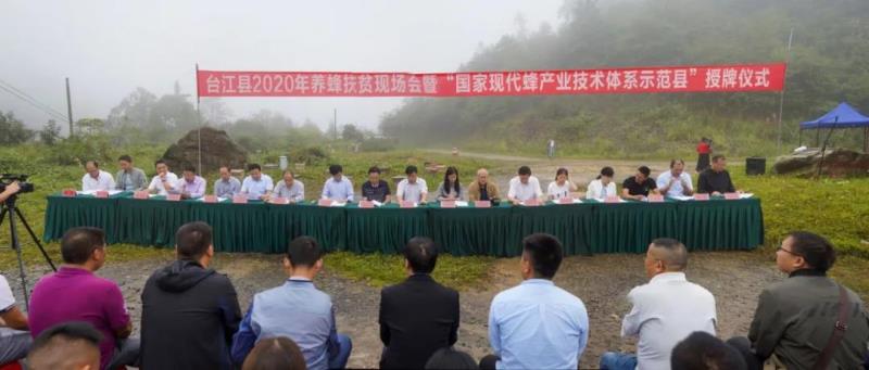9月8日,貴州省臺江縣2020年養(yǎng)蜂扶貧現(xiàn)場會暨“國家現(xiàn)代蜂產(chǎn)業(yè)技術(shù)體系示范縣”授牌儀式在臺拱街道紅陽村地質(zhì)公園大門口舉行。全國蜂產(chǎn)品標(biāo)準(zhǔn)化工作組副組長趙小川,中國蜂產(chǎn)品協(xié)會副秘書長譚麗蕊,中國知名養(yǎng)蜂專家徐祖蔭,省農(nóng)科院副院長陳永祥,省農(nóng)科院宣教處處長裴曉紅,縣領(lǐng)導(dǎo)吳世勝、全宏超、楊德昭、任四平、張博根、唐成萬等領(lǐng)導(dǎo)參加授牌儀式。授牌儀式由縣委副書記楊德昭主持。