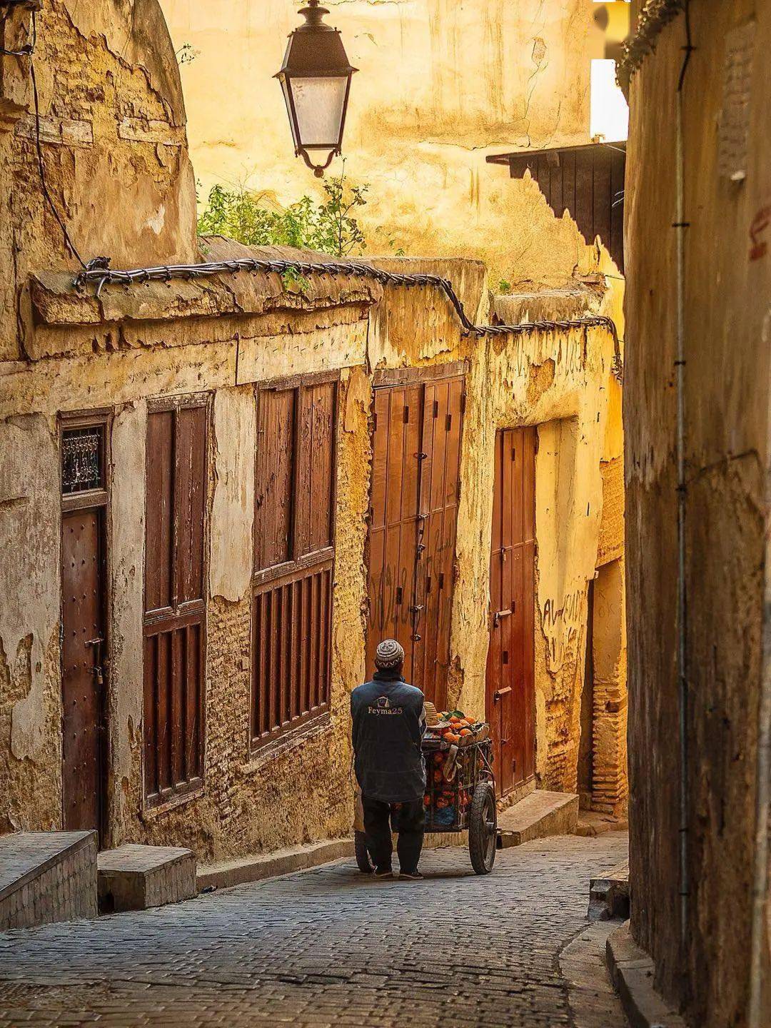 我記得菲斯古城擁有像迷宮一樣的小道,據(jù)說(shuō)即使是當(dāng)?shù)厝嗽谶@擁有近六千條巷弄的城市也末必全都熟悉。這里擠滿了販賣(mài)各種手工藝品的商店、茶餐館、肉店、蔬菜水果店等等。